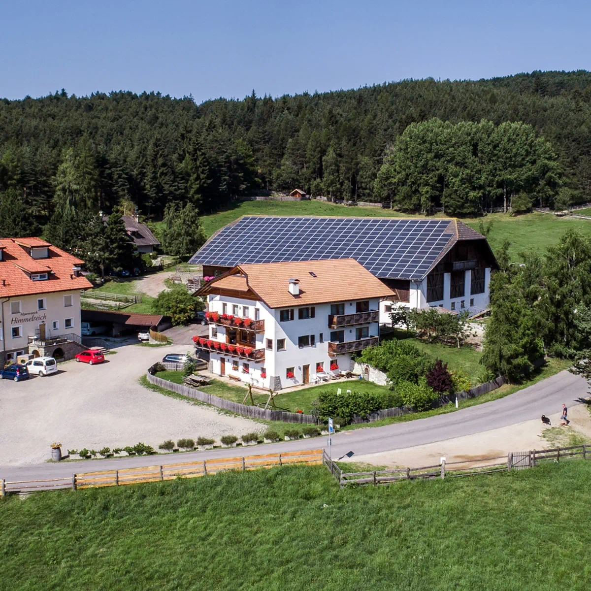 Unser Hof liegt auf 1.350 m Höhe, umgeben von Wiesen und Wäldern, nur 1,5 Kilometer vom Dorf Klobenstein entfernt. Die ruhige Lage garantiert pure Entspannung, und die Aussicht auf die Dolomiten und den Schlern ist grandios. Unser Hof erstreckt sich über 8 Hektar und umfasst den Bauernhof mit Ferienwohnungen, Stallungen und das nahegelegene, gleichnamige Restaurant. Im Jahr 2004 wurde das Bauernhaus neu gebaut, die Ferienwohnungen seither nochmals modernisiert.