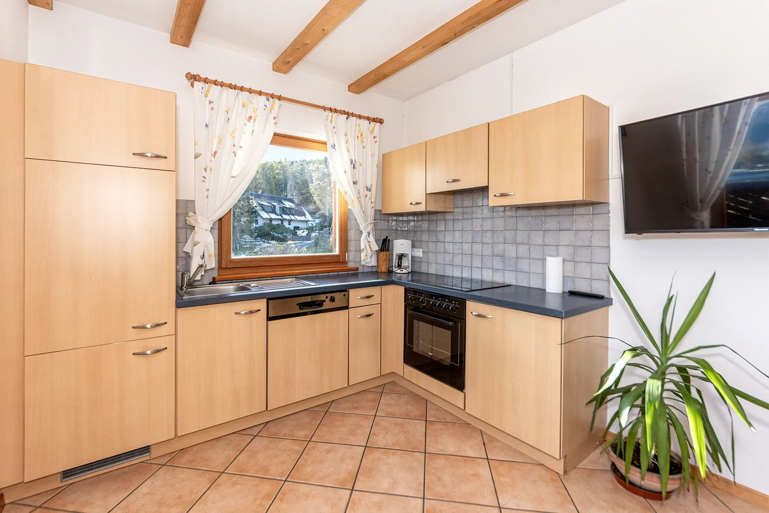 • Wohnraum mit Küche mit 4 Punkt Ceran-Kochplatte, Abzugshaube, Backrohr, Kühlschrank mit Gefrierfach, Spülmaschine, Kaffeemaschine (Filter und Mocca), Geschirr, Besteck und Kochutensilien