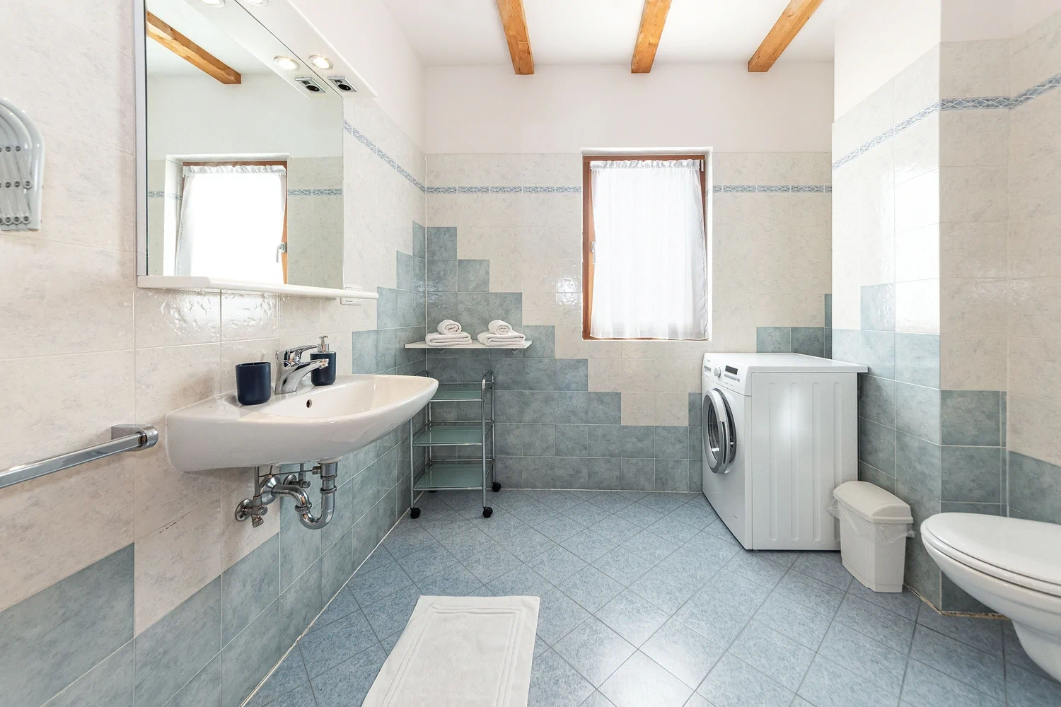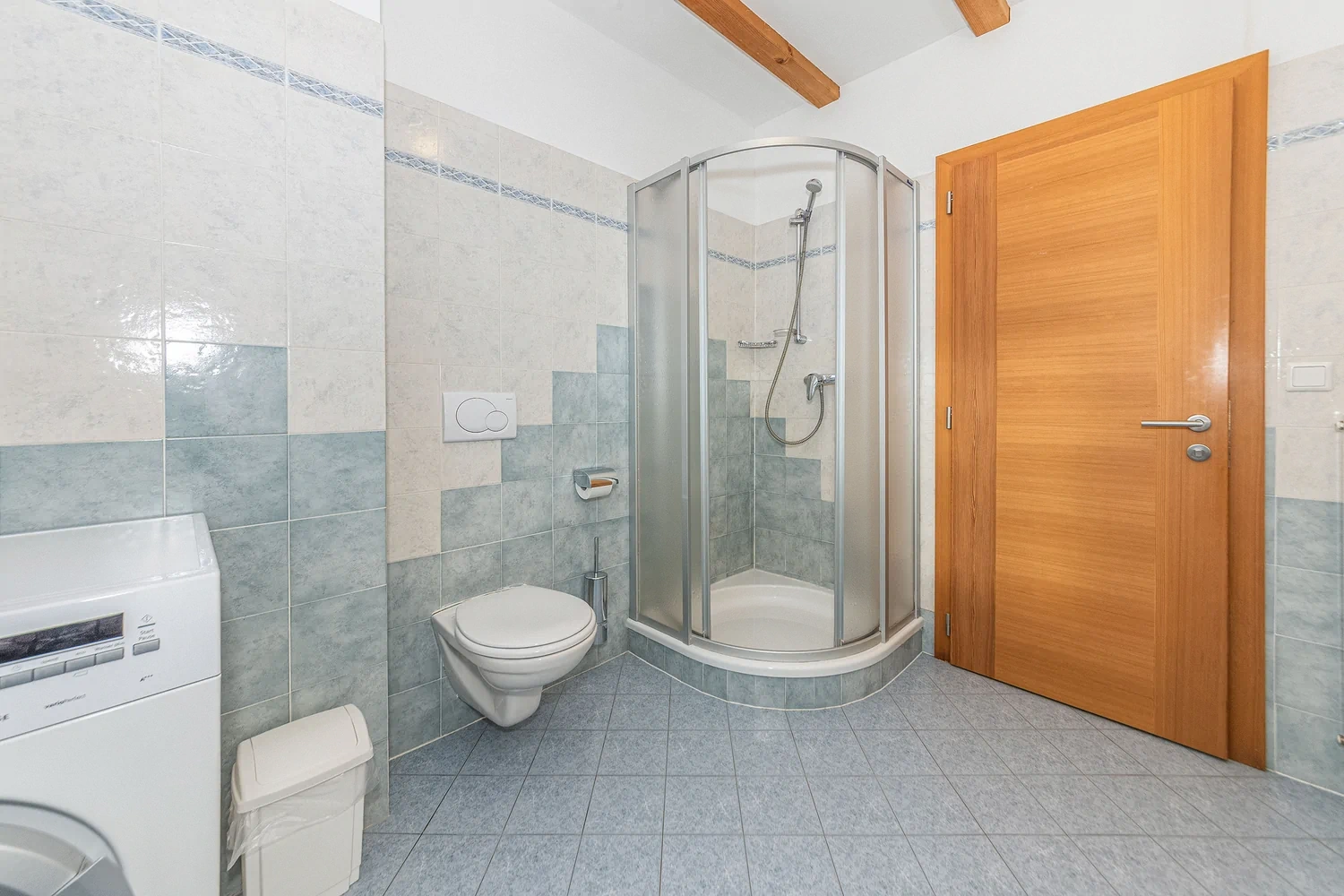• Badezimmer mit Waschtisch, WC, Dusche und Föhn